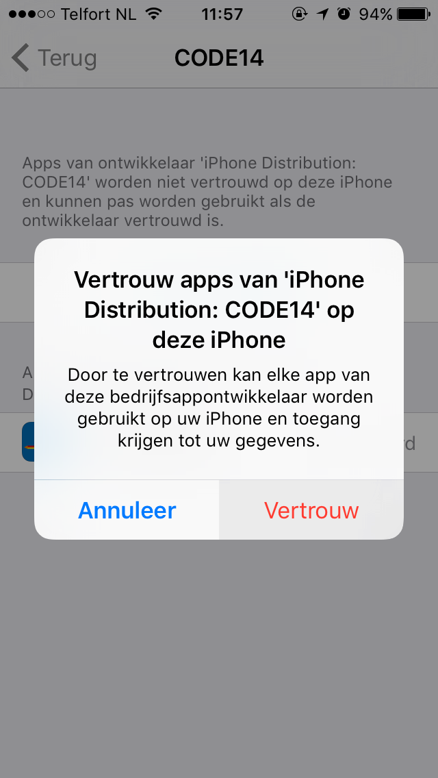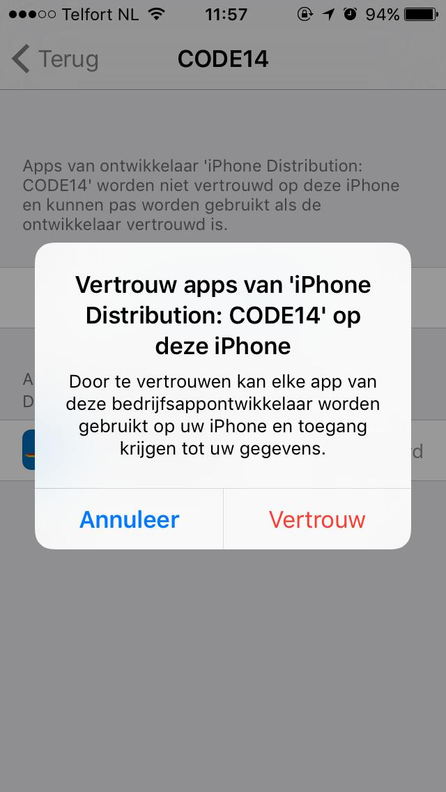 - Bij de eerste keer openen van de app vraagt hij of je de 'code14 enterprise' vertrouwt. Dit graag doen, anders opent de app niet